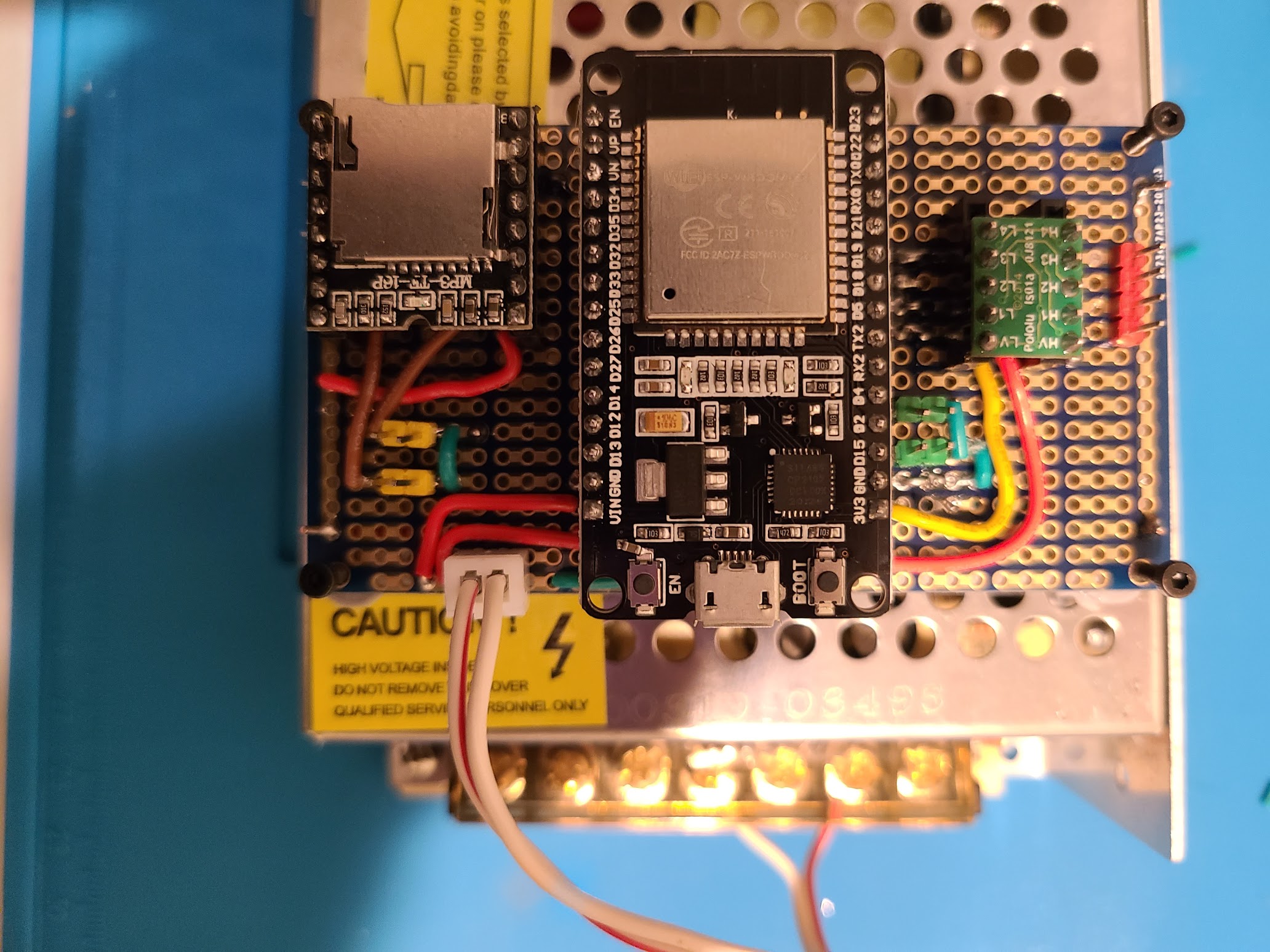 - Common ground between the ESP32, LEDs, DFPlayer, and amplifier.